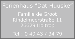 "Dat Huuske" bietet Ihnen durch die ruhige Lage, der Nähe zur Natur und der gesunden ostfriesischen Luft ein schönes Ambiente für Ihren ersehnten und erholsamen Urlaub.